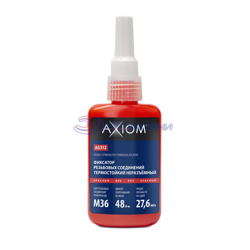 Фиксатор резьбы AXIOM® AS312 устойчив к воздействию автомобильных технических жидкостей (масла, тормозной жидкости, антифриза, бензина, дизельного топлива и др.). Полимеризуется без доступа воздуха в зазорах до 0,25 мм. Температурный диапазон эксплуатации отверждённого фиксатора от –60°C до +250°C. Момент откручивания на незатянутой резьбовой паре не менее 48 Н·м. Предел прочности на сдвиг — 27,6 МПа (4000 psi). Предназначен для крепёжных элементов размером от M8 до М36.