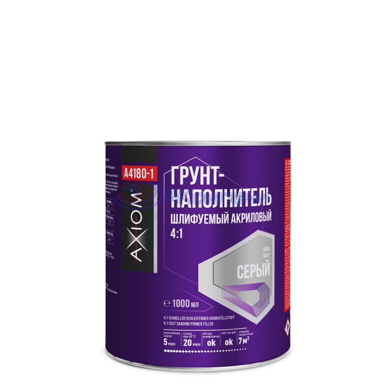 Грунт-наполнитель шлифуемый акриловый 4:1 AXIOM® A4180 пригоден для грунтования шлифованных электрофорезных покрытий, ПЭ шпатлёвок, стальных поверхностей, кислотных и эпоксидных грунтовок, старых отделочных покрытий.