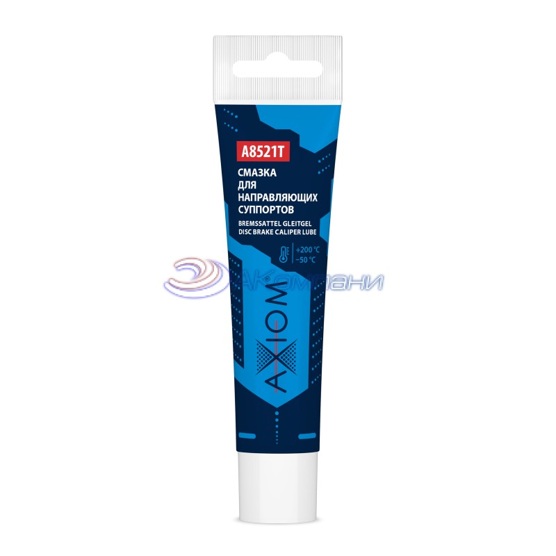 Высококачественная смазка для направляющих суппорта AXIOM® A8521T, в том числе с резиновыми втулками. Устойчива к воздействию тормозных жидкостей типа DOT3, DOT4, DOT5, DOT 5.1. Не вымывается водой, не вызывает коррозию тормозных механизмов, сохраняет эластичность резиновых уплотнительных манжет, устойчива к воздействию антигололедных реагентов, не высыхает и не теряет своих свойств в течение всего срока эксплуатации. Обеспечивает точную надежную работу тормозных механизмов и равномерный износ тормозных колодок.