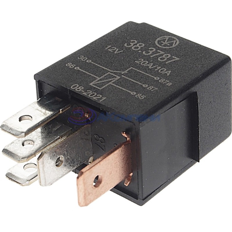Реле электромагнитное 38.3787 производства ЭНЕРГОМАШ — надёжный пятиконтактный переключатель для автомобилей ВАЗ-1118 (Калина) и других моделей, использующих аналогичный тип реле. Рассчитано на работу в бортовой сети с напряжением 12 В, обеспечивает коммутацию нагрузки до 20 А в замкнутом и до 10 А в разомкнутом положении.
