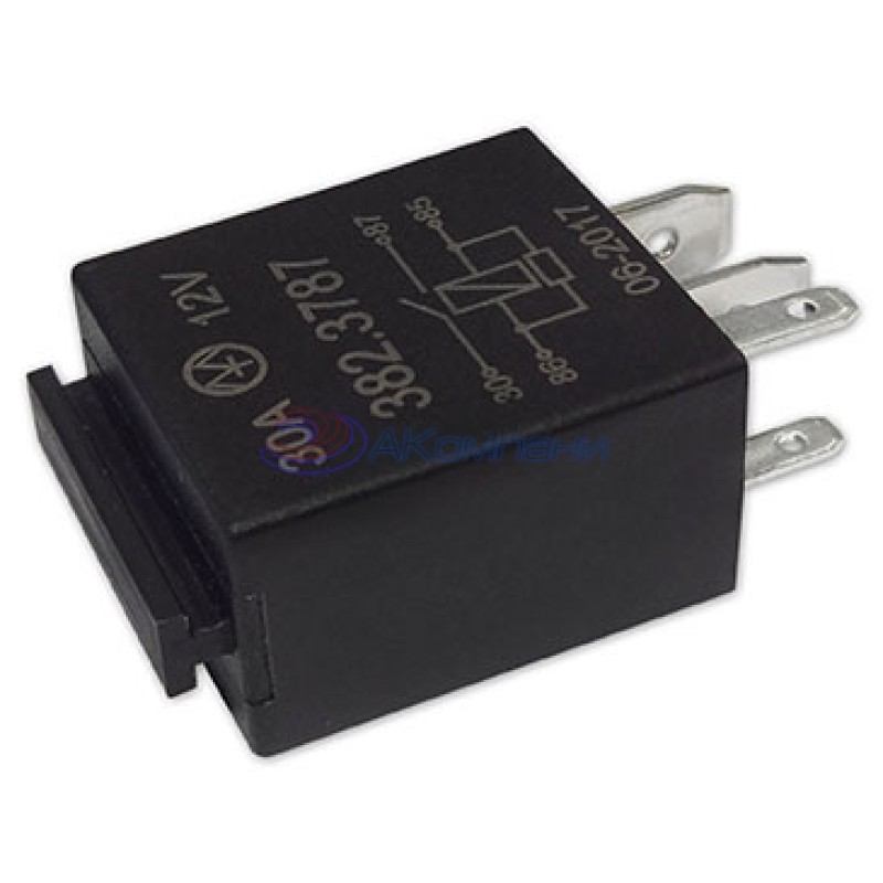 Реле электромагнитное 382.3787 от ЭНЕРГОМАШ — четырёхконтактное замыкающее реле с встроенным помехоподавляющим резистором, предназначенное для коммутации электрических цепей постоянного тока в автомобилях с напряжением бортовой сети 12 В. Максимальный ток нагрузки — 30 А.