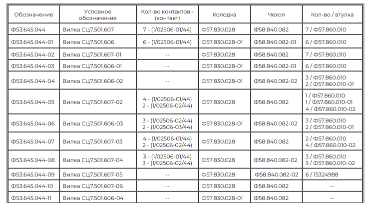 В ассортименте (см.таблицу) представлены модификации Ф53.645.044 — от базовой до исполнений -01…-11, отличающихся количеством контактов, типом колодки, чехла и комплектацией втулками.