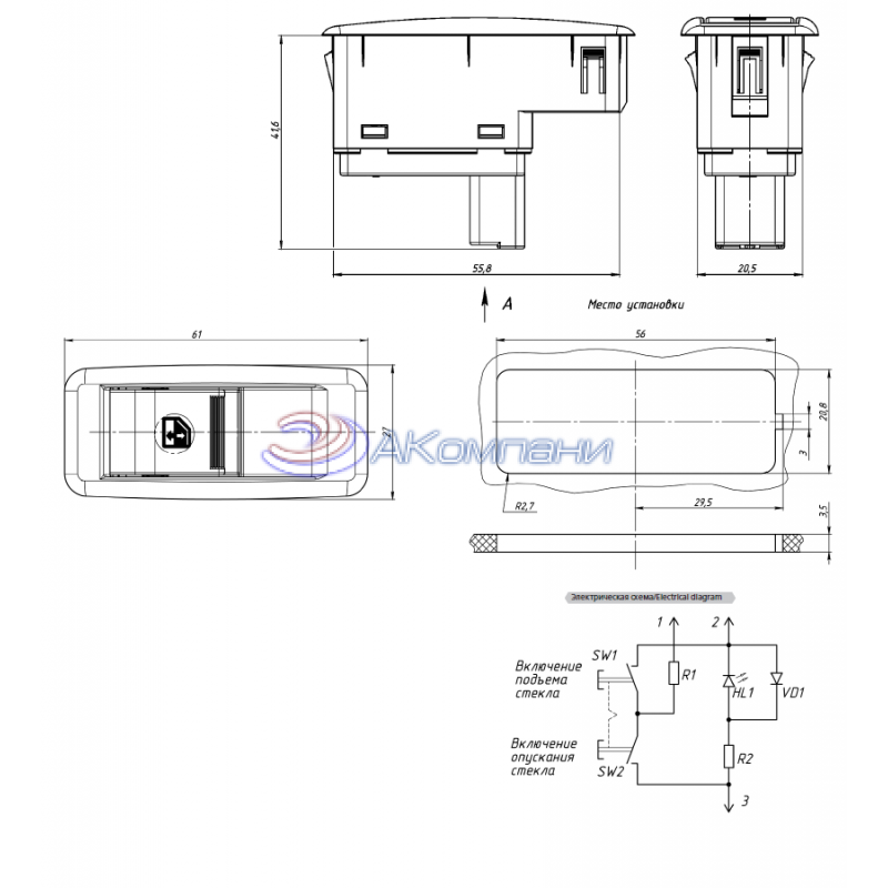 Кнопка переключателя стеклоподъемника Lada Гранта 2190, Калина 2192,2194 12V 511.3769-10