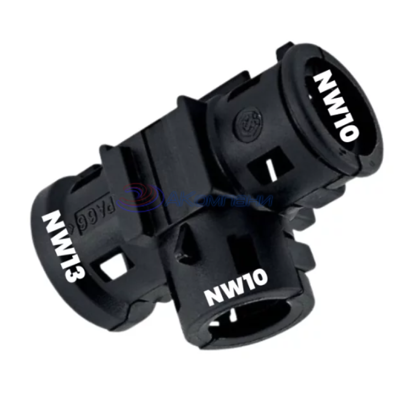 Т-образный переходник 13-10-10 Schlemmer тип A для разводки гофрированных труб. Универсальный адаптер позволяет соединить три типа гофры разных диаметров: основной вход NW13, выходы NW10 и NW10.