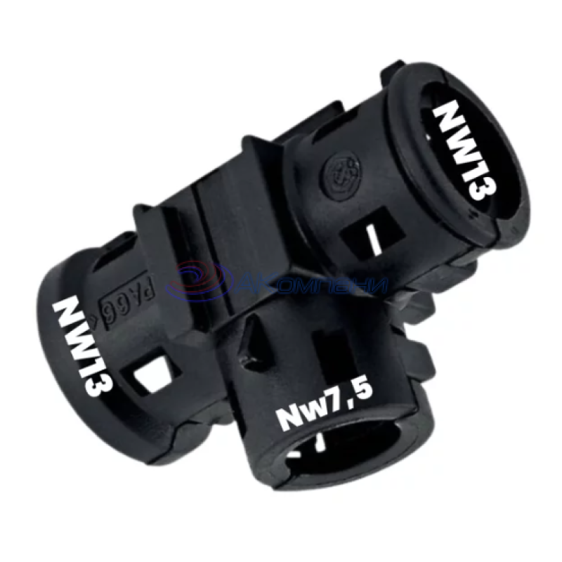 Т-образный переходник тип A 13-13-7,5 Schlemmer для разводки гофрированных труб. Универсальный адаптер позволяет соединить три типа гофры разных диаметров: основной вход NW13, выходы NW13 и NW7,5.