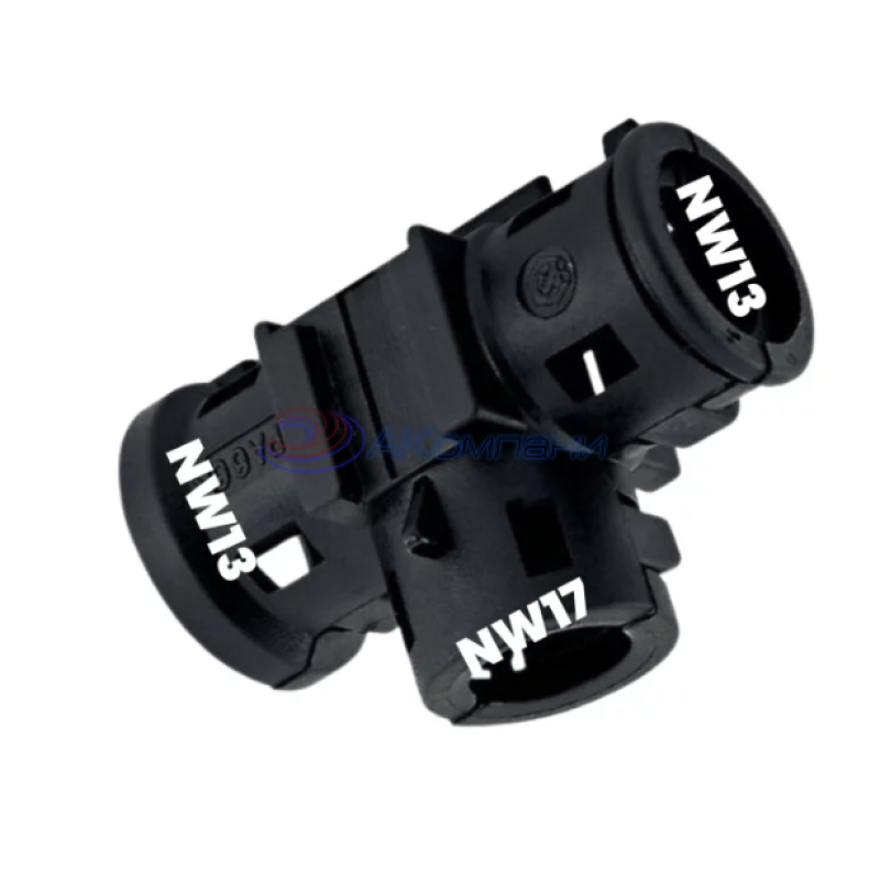 Т-образный переходник тип A 17-13-13 Schlemmer для разводки гофрированных труб. Универсальный адаптер позволяет соединить три типа гофры разных диаметров: основной вход NW17, выходы NW13 и NW13.