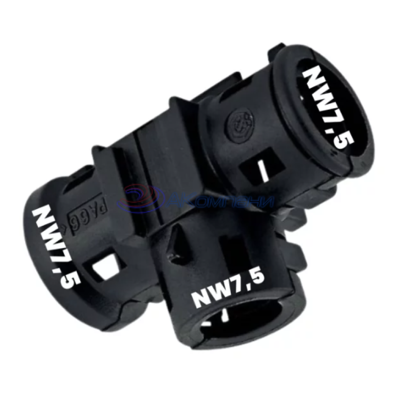 Т-образный переходник тип A 7,5-7,5-7,5 Schlemmer для разводки гофрированных труб. Универсальный адаптер позволяет соединить три типа гофры разных диаметров: основной вход NW7,5, выходы NW7,5 и NW7,5.