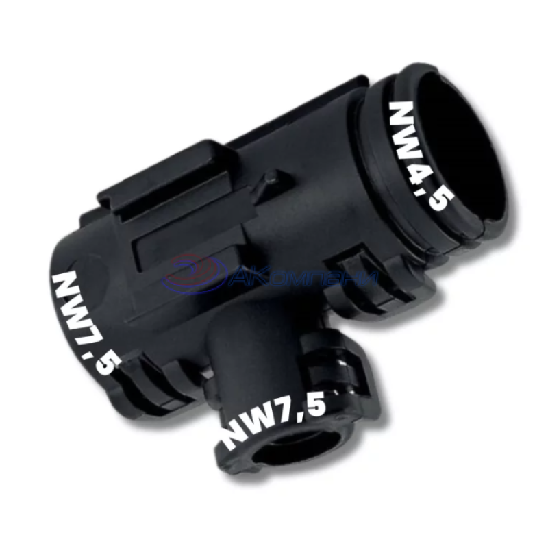 Т-образный переходник тип B 7,5-7,5-4,5 Schlemmer для разводки гофрированных труб. Универсальный адаптер позволяет соединить три типа гофры разных диаметров: основной вход NW7,5, выходы NW7,5 и NW4,5.