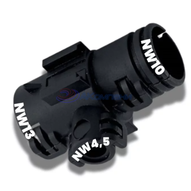 Т-образный переходник тип C 13-4,5-10 Schlemmer для разводки гофрированных труб. Универсальный адаптер позволяет соединить три типа гофры разных диаметров: входы NW13 и NW4,5, выход NW10.
