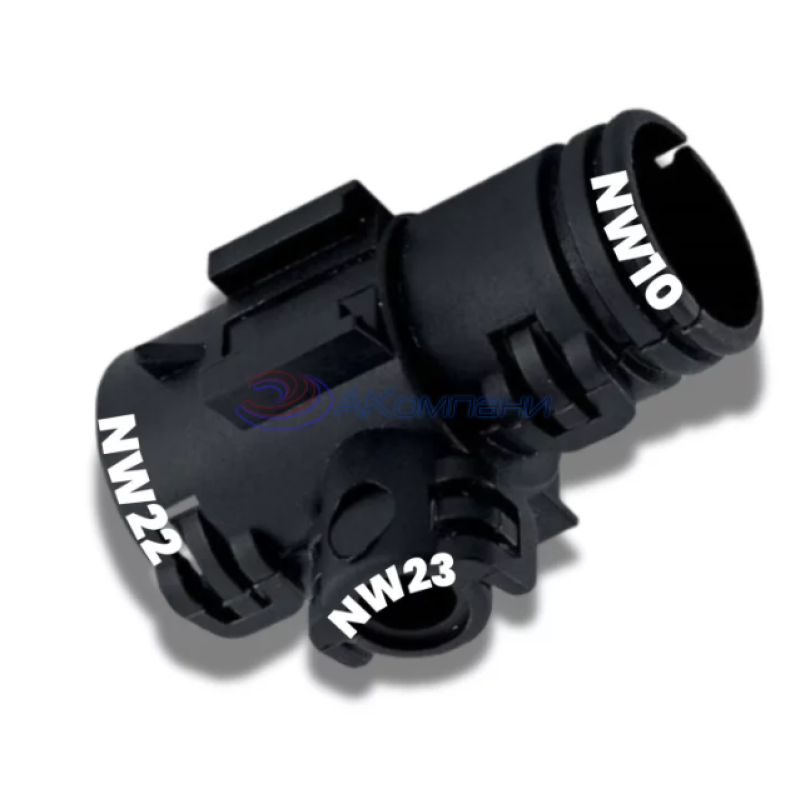 Т-образный переходник тип C 22-23-10 Schlemmer для разводки гофрированных труб. Универсальный адаптер позволяет соединить три типа гофры разных диаметров: входы NW22 и NW23, выход NW10.