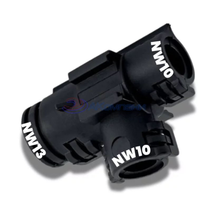 Т-образный переходник тип D 13-10-10 Schlemmer для разводки гофрированных труб. Универсальный адаптер позволяет соединить три типа гофры разных диаметров: входы NW13 и NW10, выход NW10.